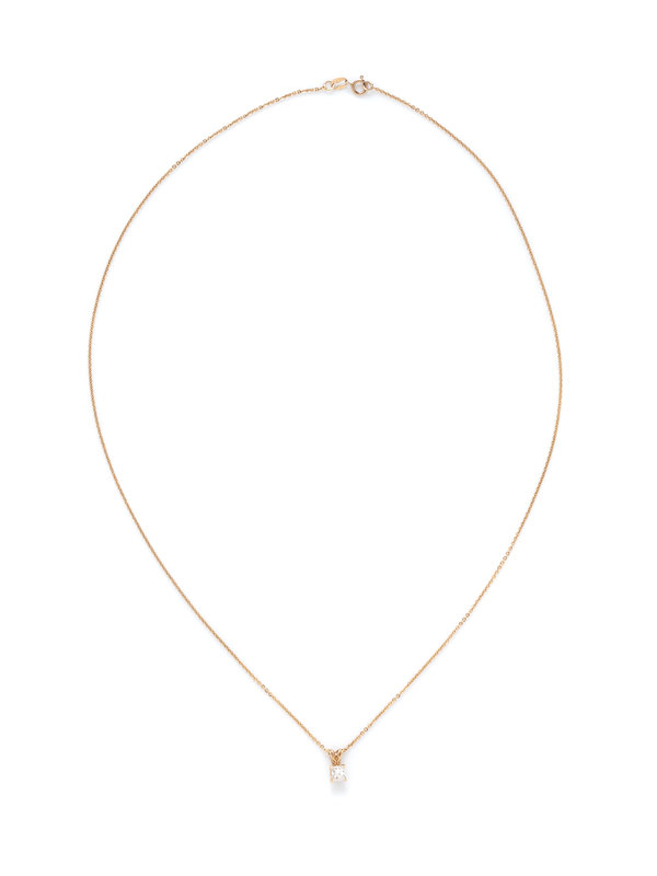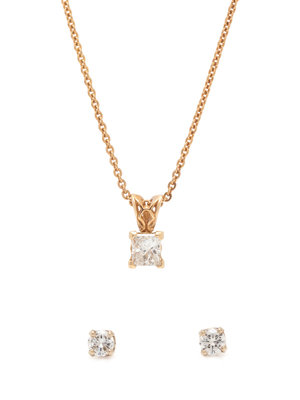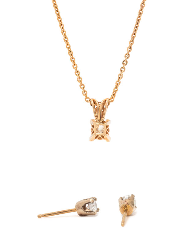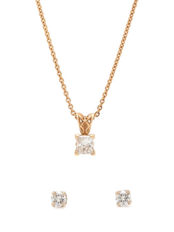 Consisting of a cable link chain suspending a pendant containing one princess cut diamond weighing approximately 0.35 carat, together with a pair of stud earrings containing two round brilliant cut diamonds weighing approximately 0.30 carat total. Necklace: 20 inches long.