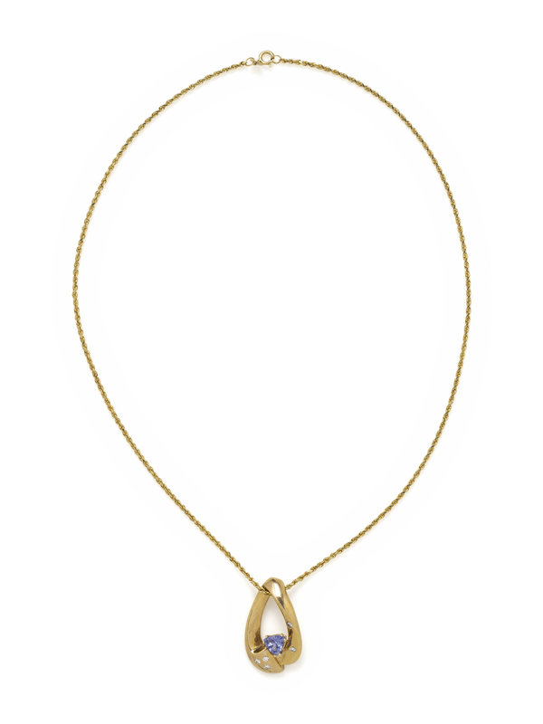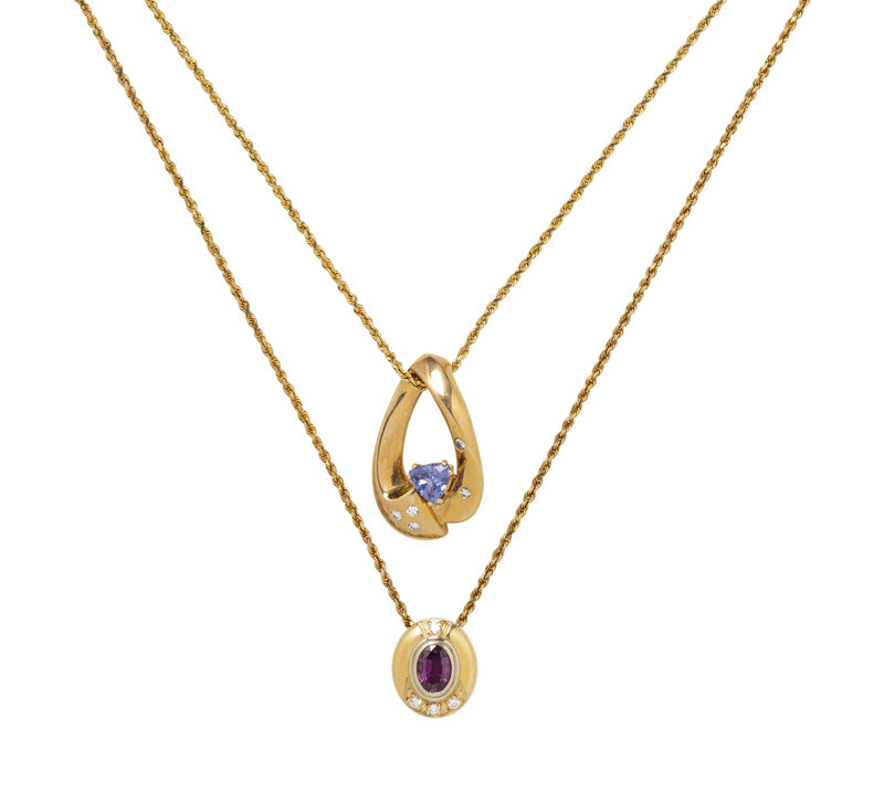 Consisting of a rope link chain suspending a pendant containing one oval mixed cut pink-purple sapphire and four round brilliant cut diamonds, together with a rope link chain suspending a pendant containing one triangular shaped tanzanite and five round brilliant cut diamonds. 18 and 16 inches long.