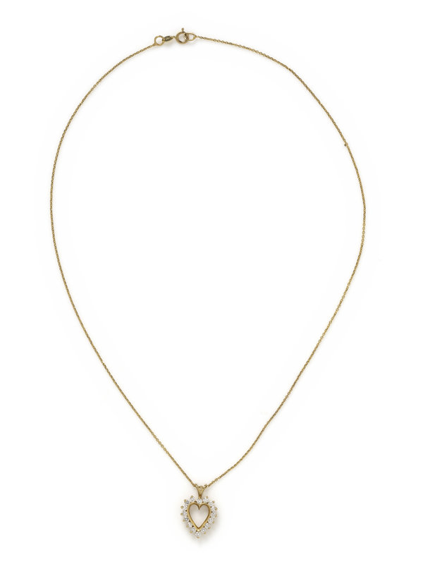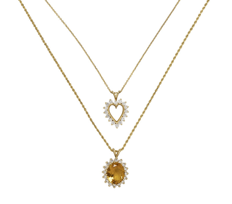 Consisting of rope link chain suspending a pendant containing one oval mixed cut citrine and 16 round brilliant cut diamonds weighing approximately 0.40 carat, together with a cable link chain suspending a heart shaped pendant containing 16 round brilliant cut diamonds weighing approximately 0.60 carat total. 18 and 17 inches long.