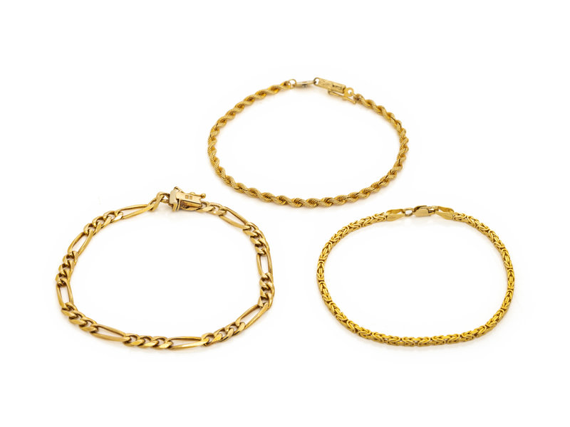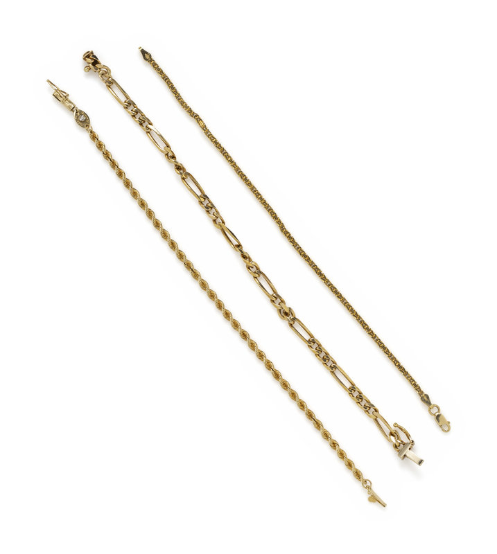 Consisting of one rope, one Byzantine, and one Figaro chain bracelet. 7, 6 3/4 and 7 1/4 inches long.