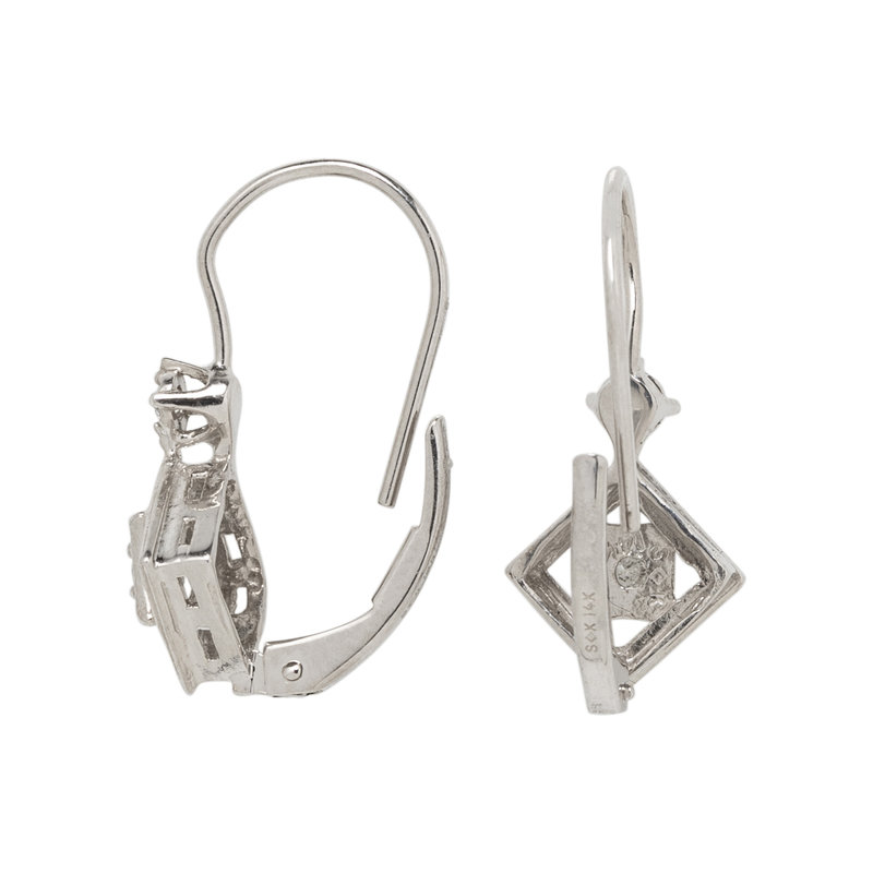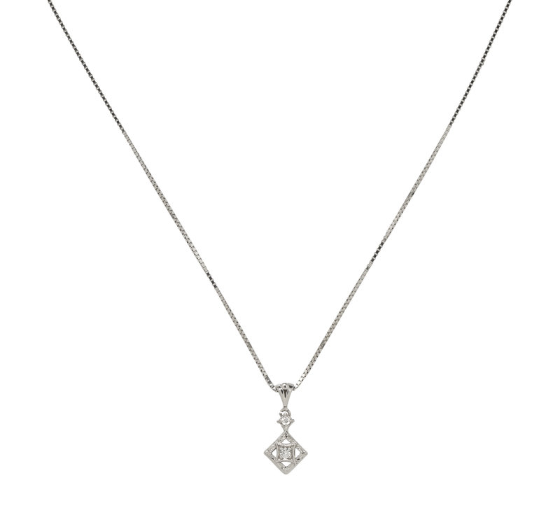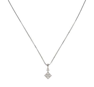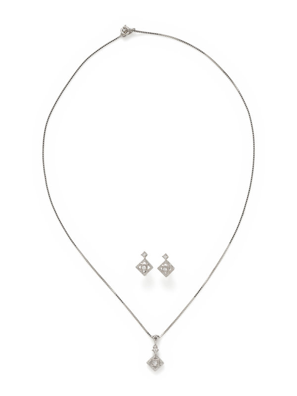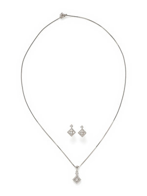 Consisting of a box link chain suspending a pendant containing two round brilliant cut diamonds, together with a pair of earrings containing four round brilliant cut diamonds. Necklace: 17 inches long. Earring: 7/8 inch long.