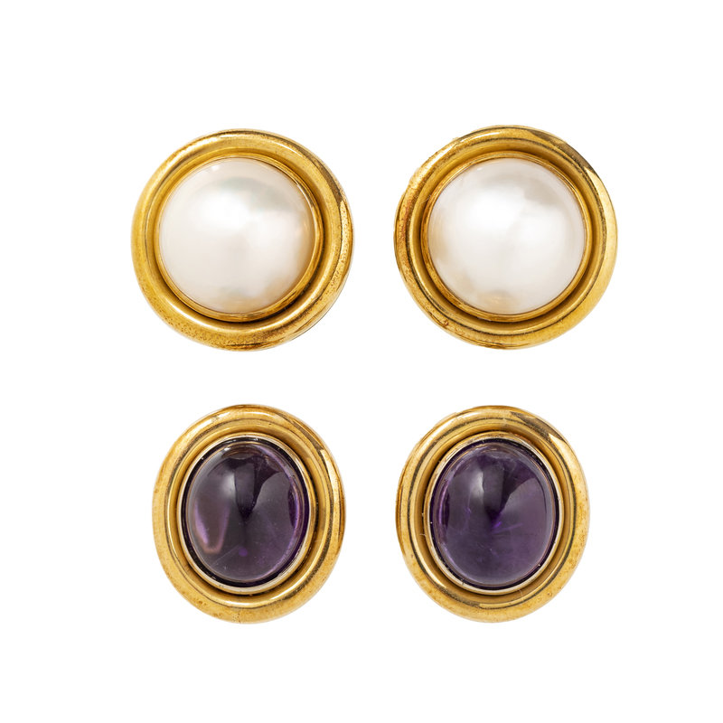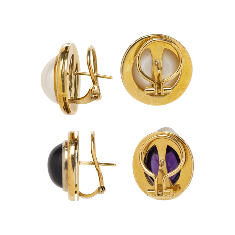 Consisting of a pair of earclips containing two oval cabochon amethyst measuring approximately 13.00 x 11.00 mm, together with a pair of earclips containing two cultured mabe pearls measuring approximately 14.50 mm wide, posts with clip backs. 3/4 and 7/8 inch wide.