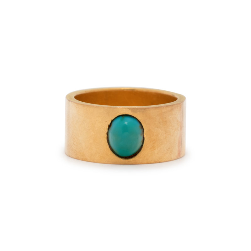 Consisting of a band measuring approximately 9.00 mm wide containing one oval turquoise cabochon measuring approximately 6.70 x 5.50 mm. Ring size 5.
