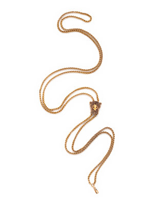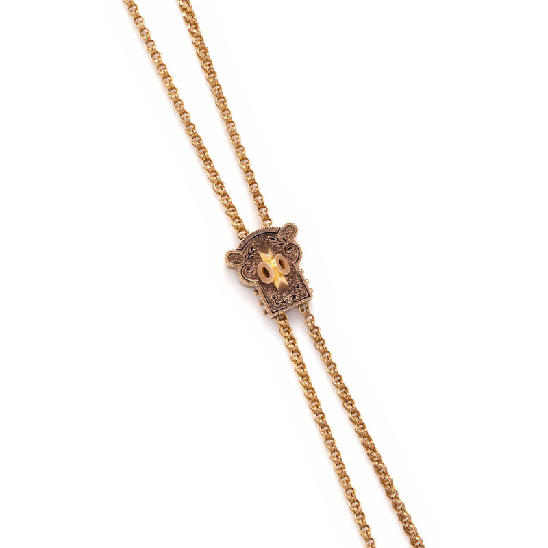 Consisting of a yellow gold fancy cable link chain together with a yellow gold-filled and enamel slide charm. 33 inches long.