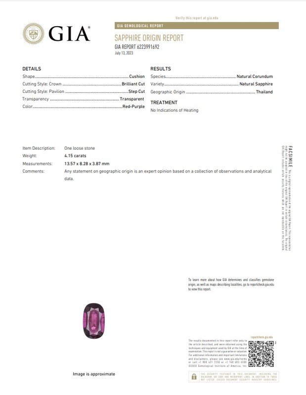 GIA, 2023, Report No. 6223991692, 4.15 carats, Natural Corundum, Sapphire, Red-Purple color, Thailand, No heat