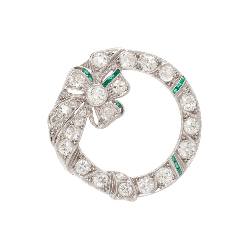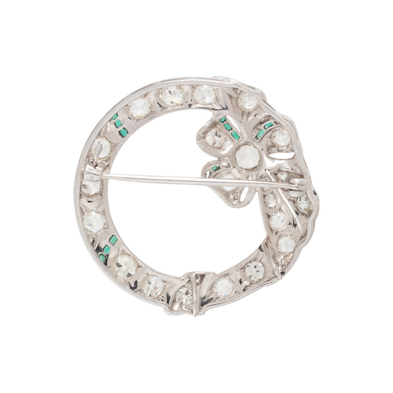 Containing 24 old European and old mine cut diamonds weighing approximately 3.50 carats total and 12 French cut synthetic emeralds. Mounted in platinum. 1 1/2 x 1 1/2 inches.