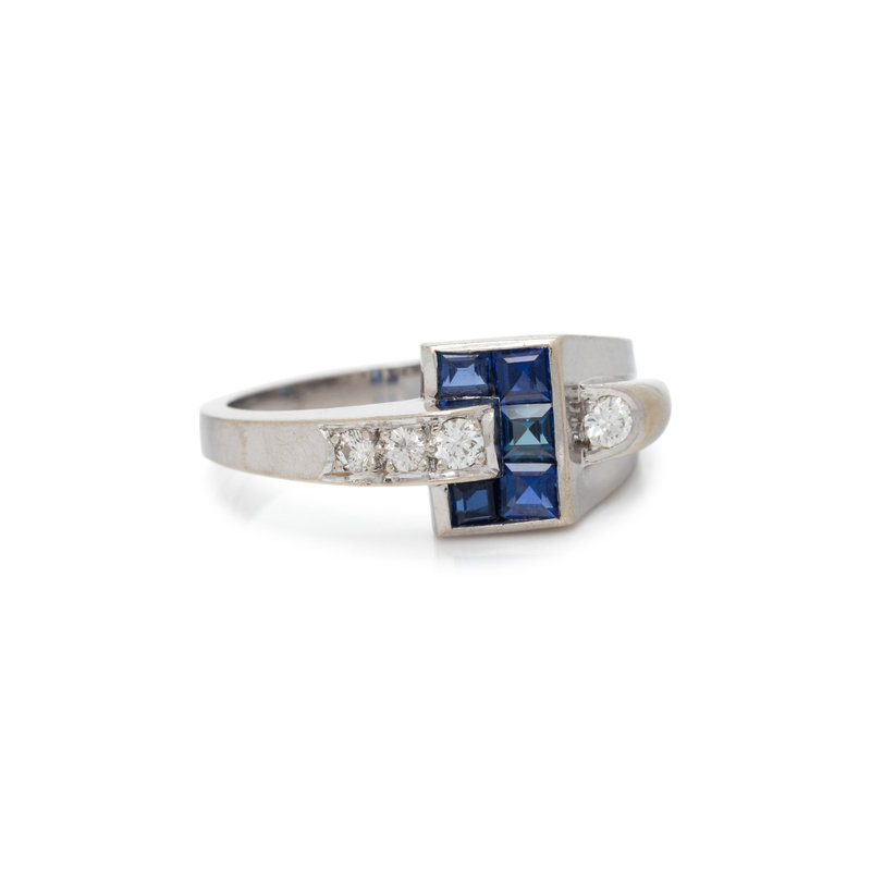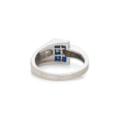 Containing five square step cut sapphires and four round brilliant cut diamonds. Mounted in white gold. Ring size 6 1/2.