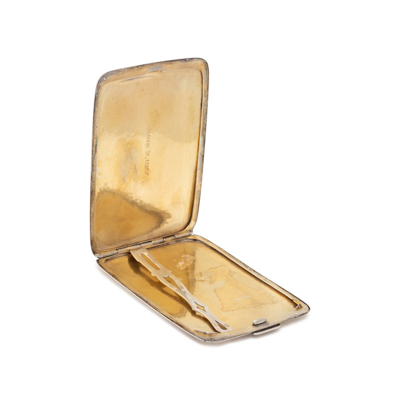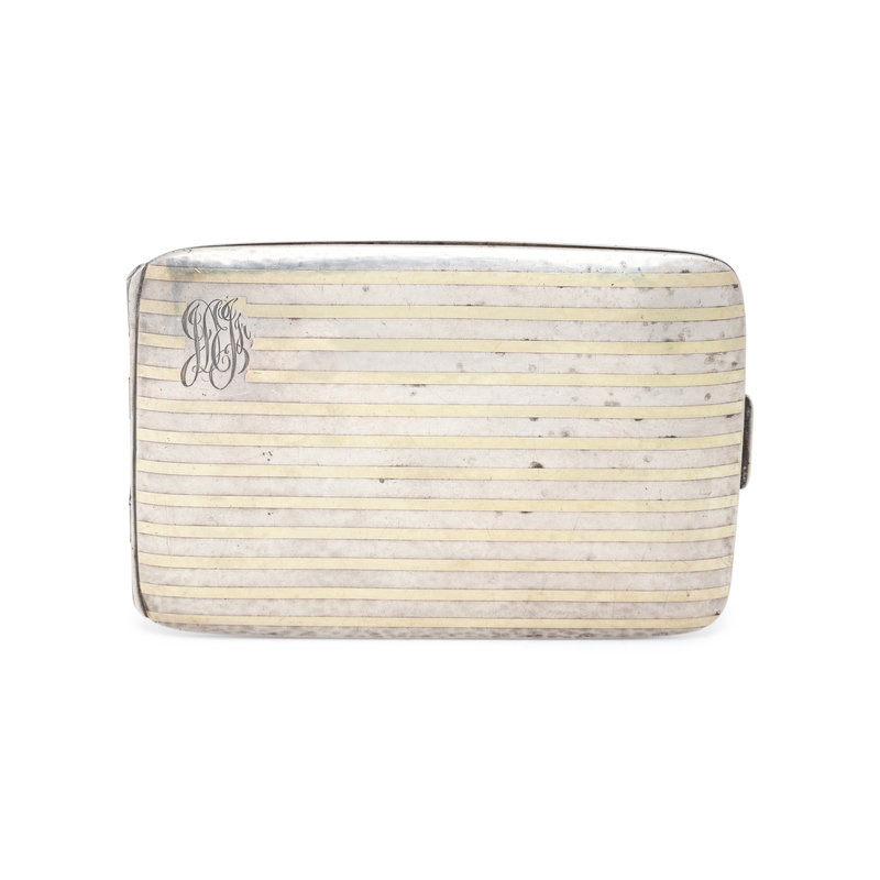 Consisting of yellow gold and silver stripes with a corner monogram and the inside personally engraved "June 2, 1917". 4 3/8 x 3 inches.