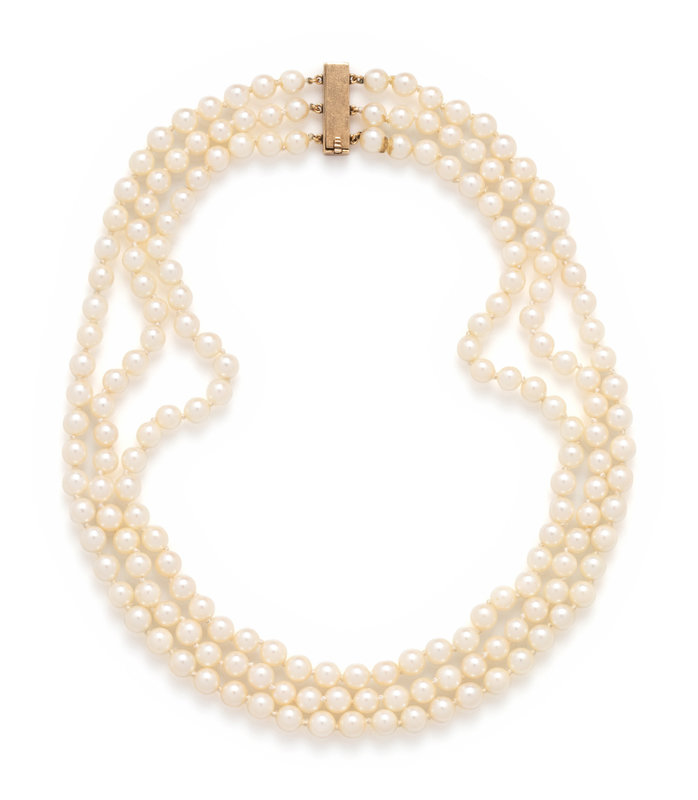 Consisting of three strands with pearls measuring approximately 5.00 mm in diameter, strung knotted with yellow gold clasp. 14 inches long.
