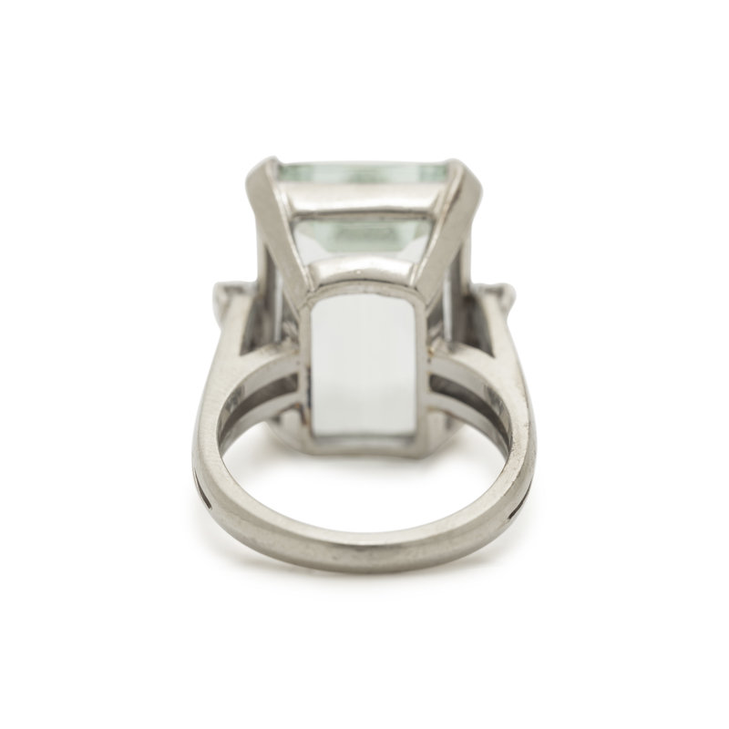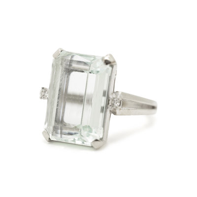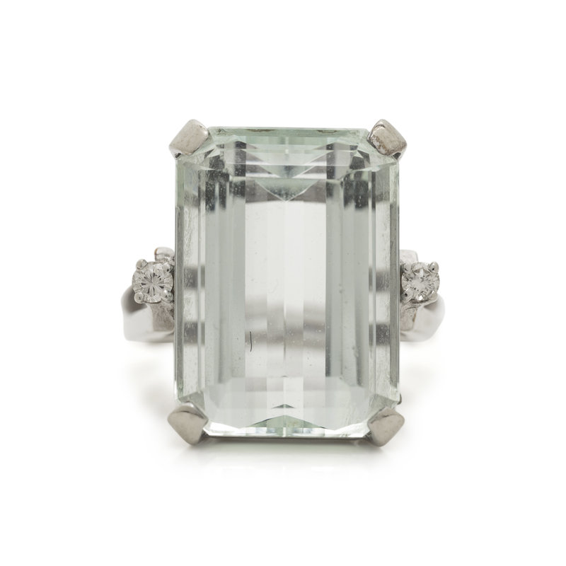 Containing one rectangular cut aquamarine measuring approximately 17.85 x 12.95 x 9.10 mm and two round brilliant cut diamonds. Mounted in white gold. Ring size 6.