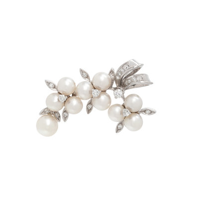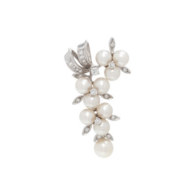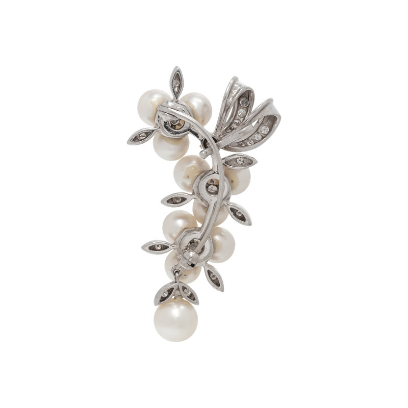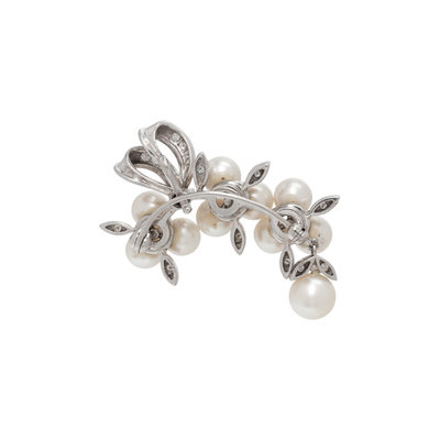 Containing 22 single and round brilliant cut diamonds weighing approximately 0.85 carat total, and ten pearls with the largest measuring approximately 7.60 mm in diameter. Mounted in white gold. 1 inch x 2 inches.