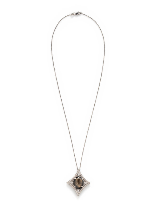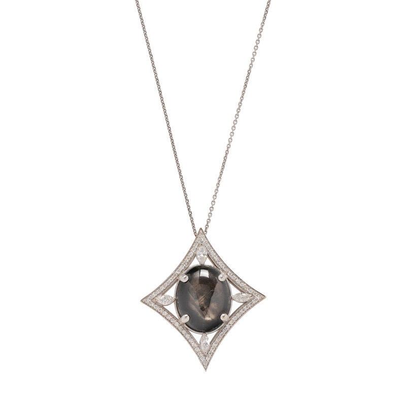 Containing one oval cabochon black star sapphire measuring approximately 15.90 x 12.65 x 4.50 mm, four marquise and 64 round brilliant cut diamonds weighing approximately 0.80 carat total, suspended from a cable link chain. 18 inches long.