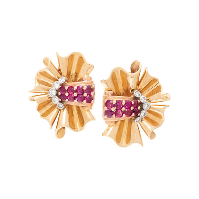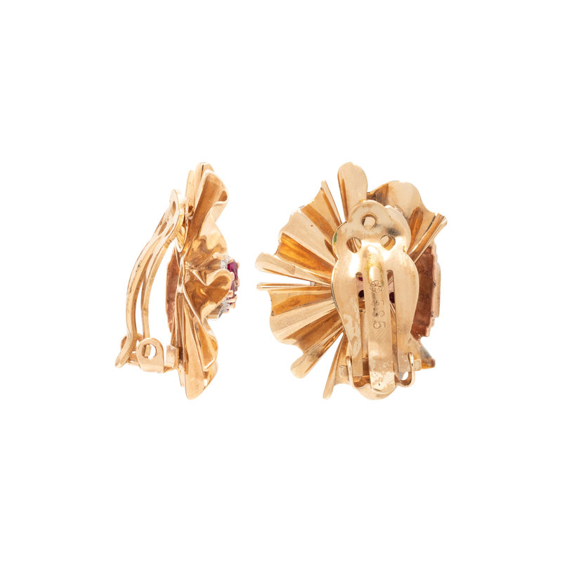 RETRO, TRICOLOR GOLD, RUBY AND DIAMOND EARCLIPS