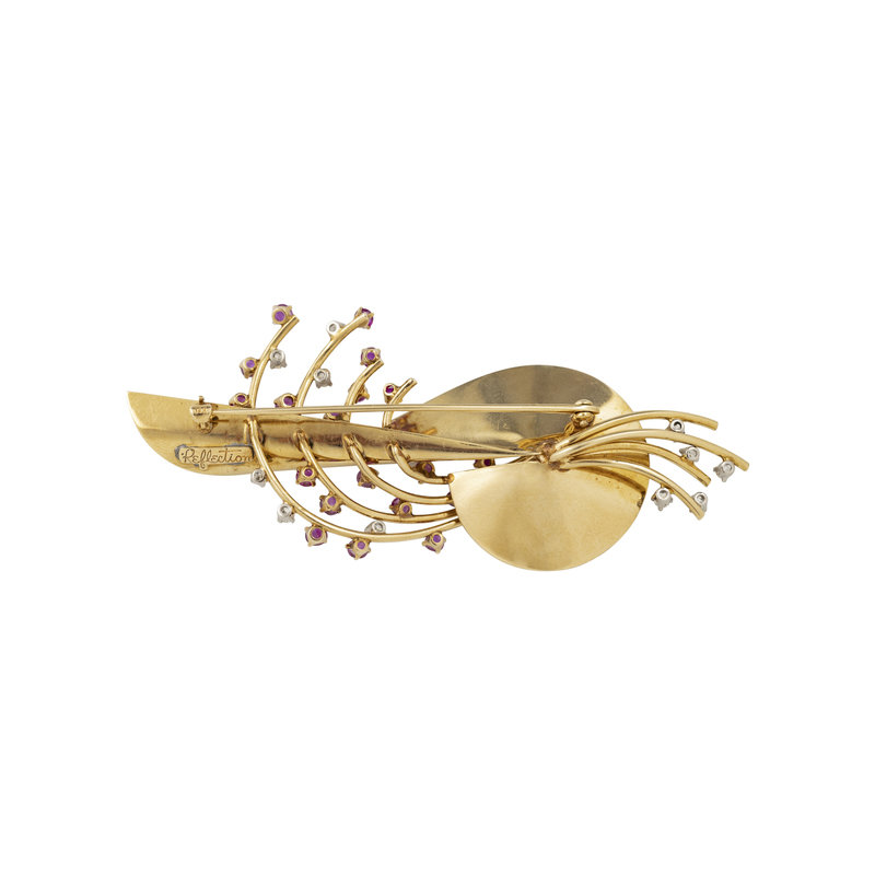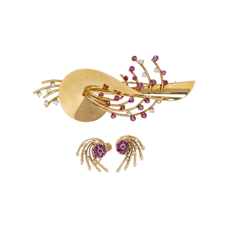 Consisting of a brooch containing 19 round mixed cut rubies and 11 transitional and single cut diamonds weighing approximately 0.50 carat, together with a pair of earrings containing 14 round mixed cut rubies and 18 single cut diamonds. Brooch: 3 1/2 x 1 1/4 inches. Earrings: 3/4 inch long.