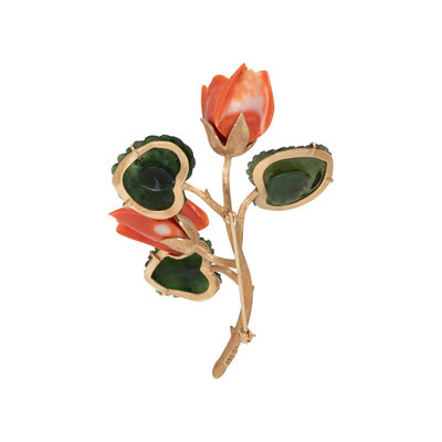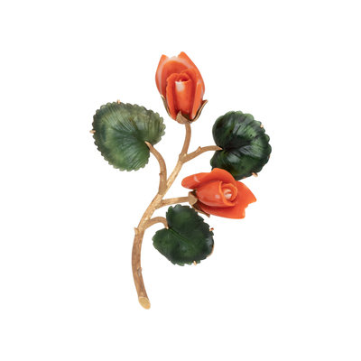 Consisting of a textured gold flower containing carved coral petals and carved nephrite leaves. 2 7/8 x 2 inches.