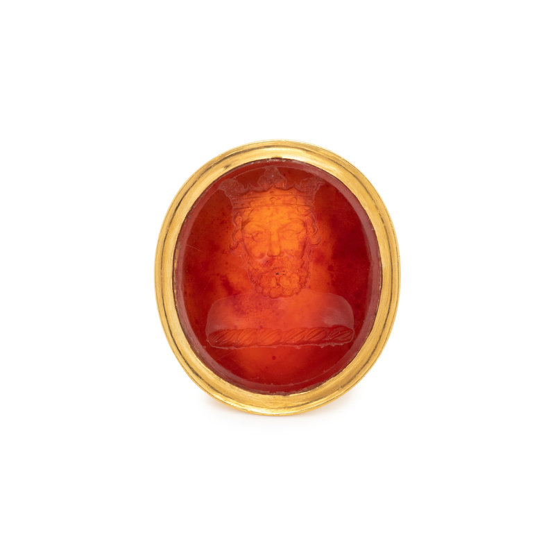 Containing one oval carnelian intaglio measuring approximately 24.00 x 21.50 mm depicting the Earl of Lindsey. Ring size 8.