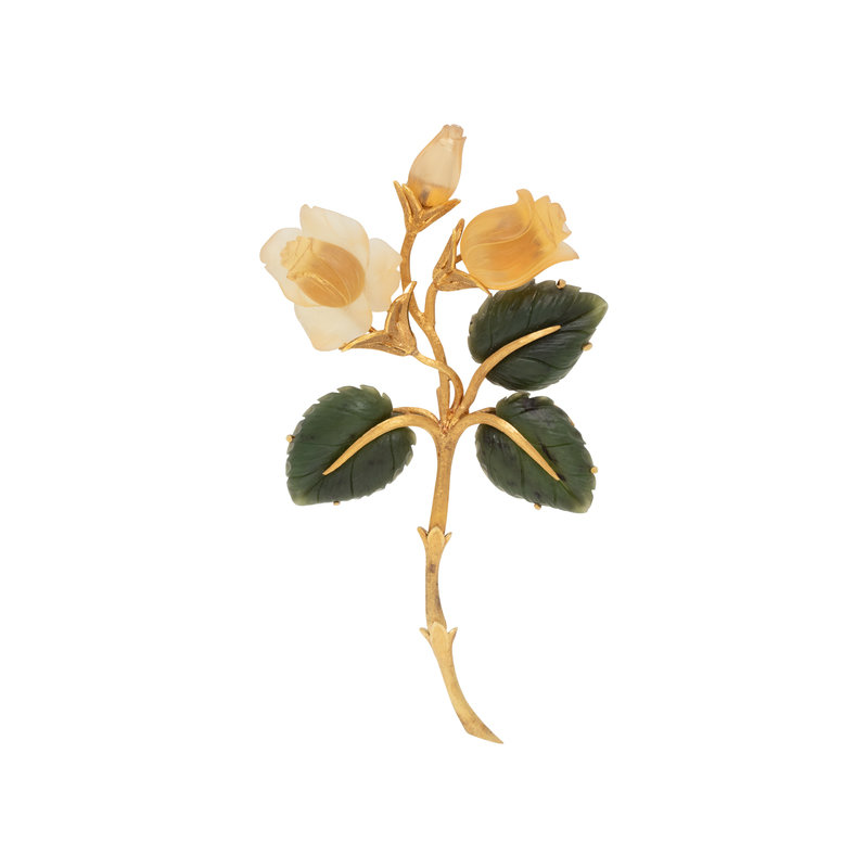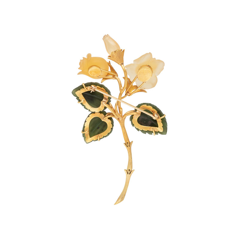Consisting of a textured gold flower with articulated stem containing carved citrine petals and carved nephrite leaves. 3 7/8 x 2 inches.