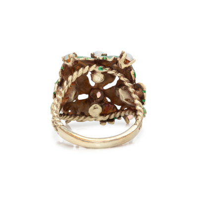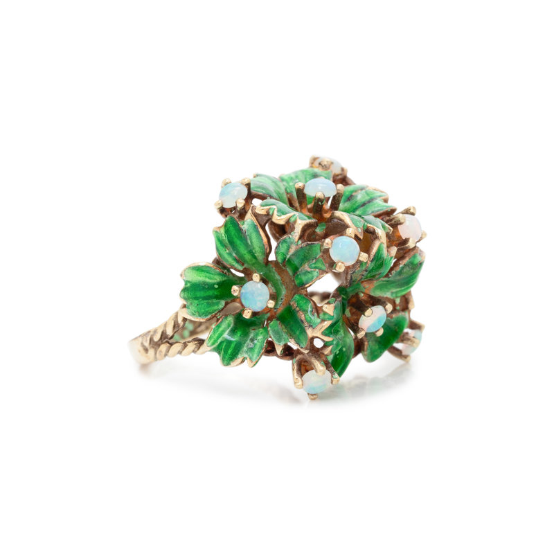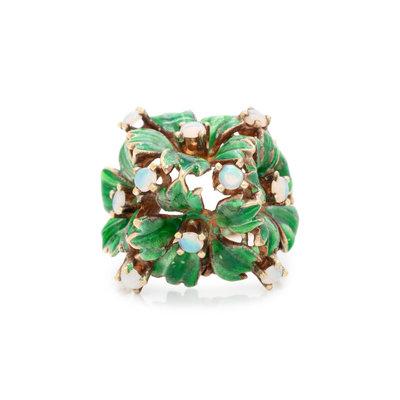 Consisting of four flowers with green enamel petals and opal centers, with opal accents. Mounted in yellow gold. Ring size 6 1/4.