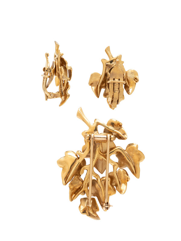 Consisting of a brooch and earclips with a matte finish design. Brooch: 2 x 1 1/2 inches. Earclips: 1 inch long.
