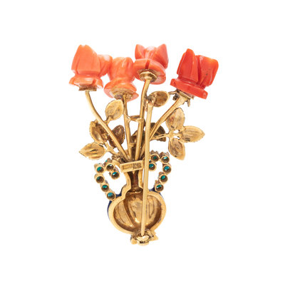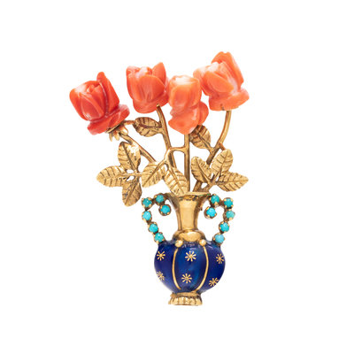 Consisting of carved coral roses in a yellow gold vase with turquoise and blue enamel detail. 2 x 1 1/2 inches.