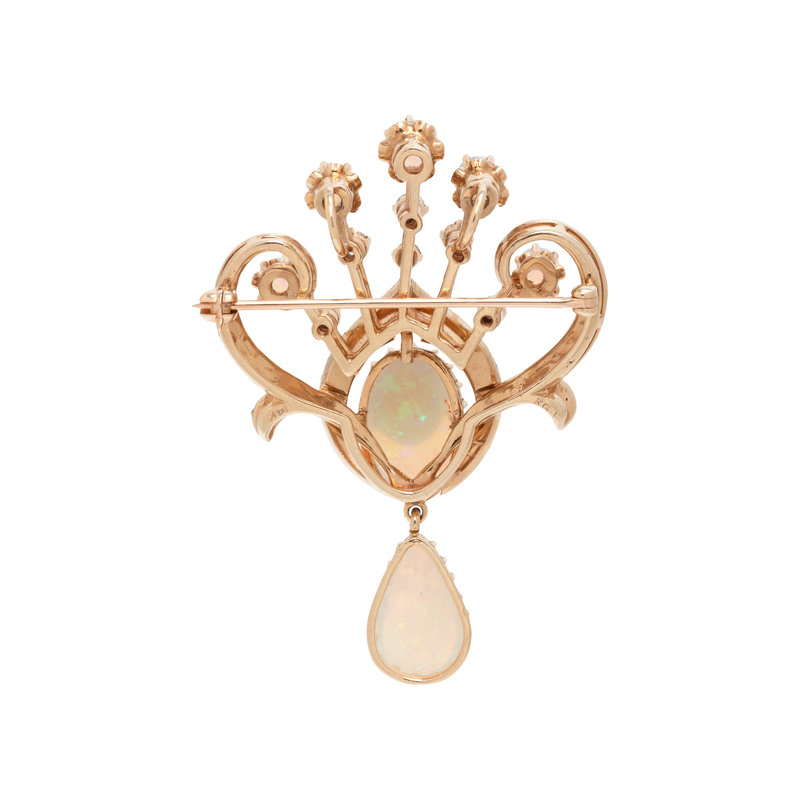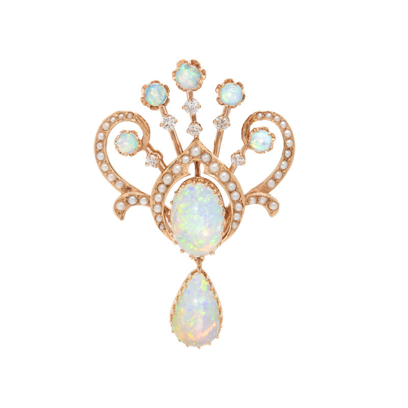 Containing seven opals of various shapes and sizes, numerous seed pearls, and six round brilliant cut diamonds. Mounted in yellow gold. 2 x 1 1/2 inches.