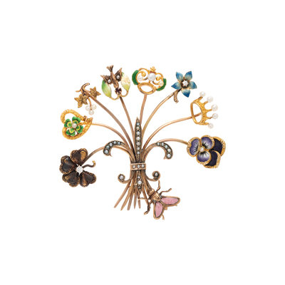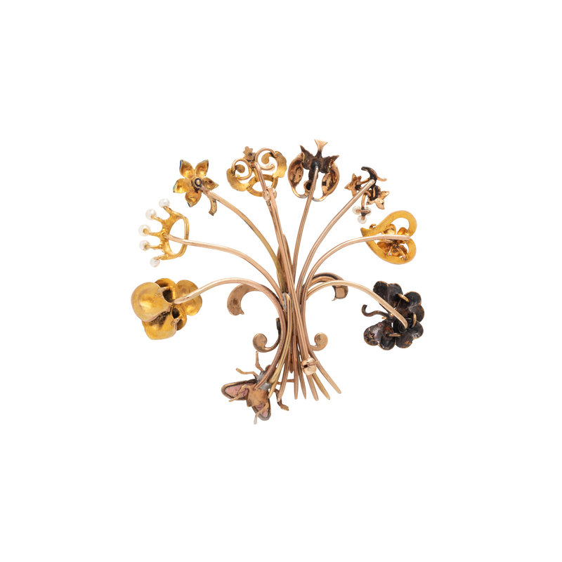 Consisting of eight stick pin elements with polychrome enamel, seed pearl, diamond and gemstone detail, with fleur-de-lis center. Mounted in yellow gold. 2 1/4 x 2 inches.