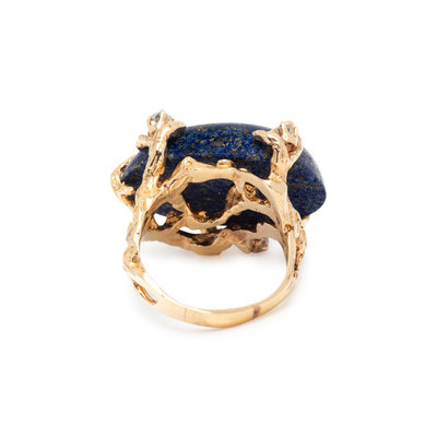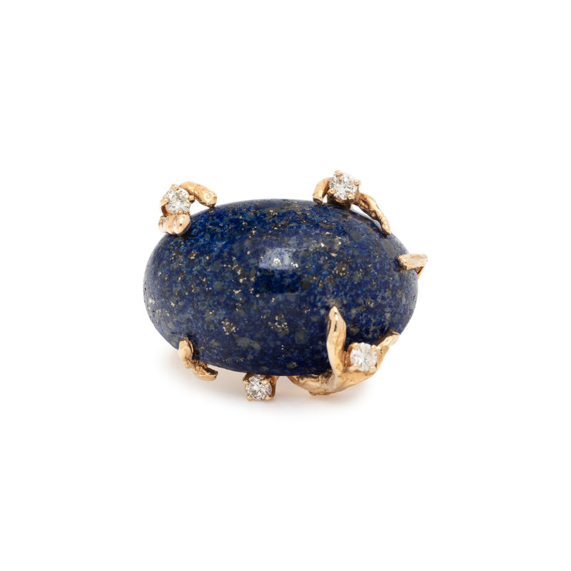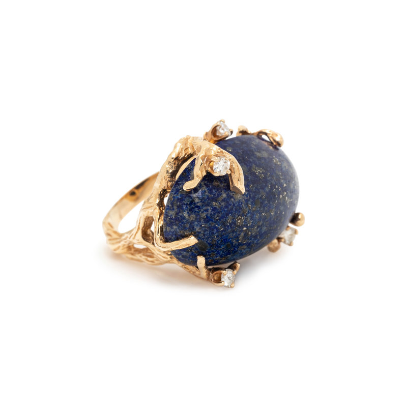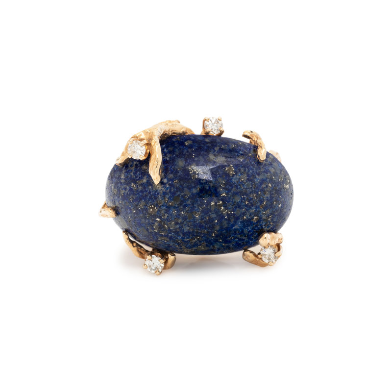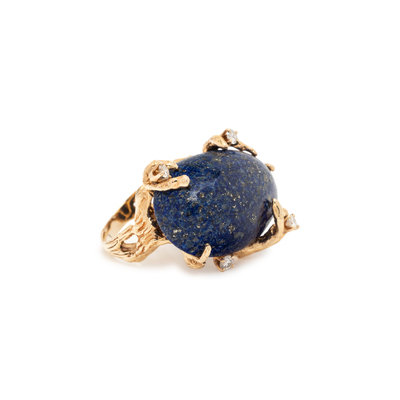 Containing one oval cabochon lapis lazuli measuring approximately 29.00 x 19.50 mm and four round brilliant cut diamonds weighing approximately 0.35 carat total. Mounted in yellow gold. Ring size 10.