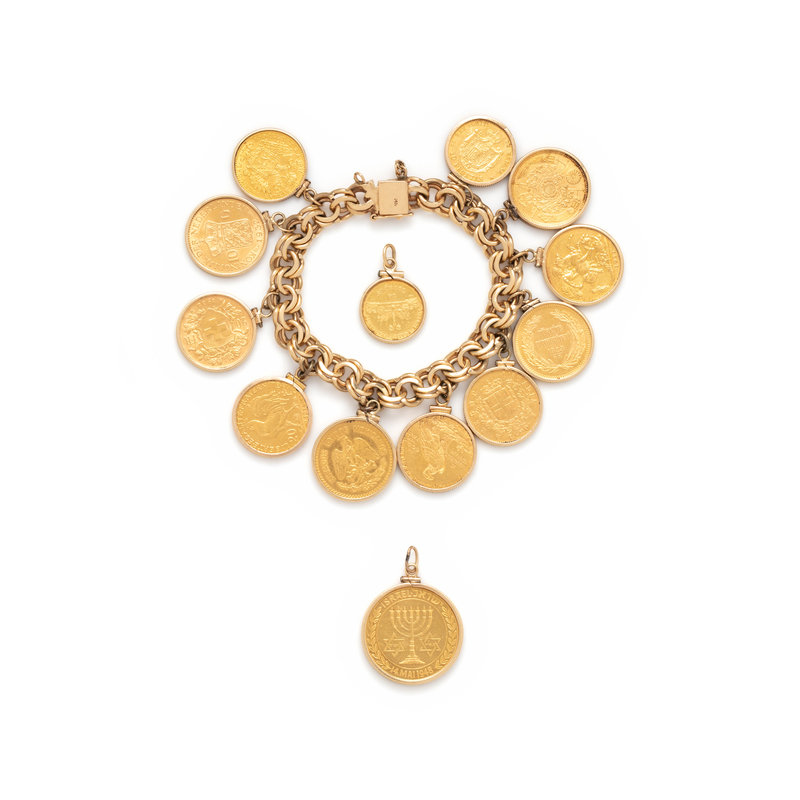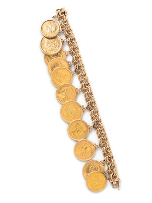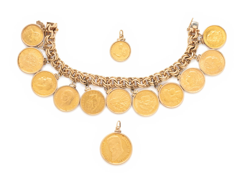 Consisting of a fancy link bracelet suspending 11 coin charms, together with two coin charms. 7 1/4 inches long.