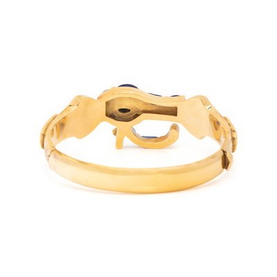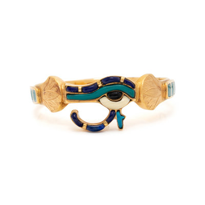 In an Egyptian revival style, containing lapis lazuli, light blue hardstone and bone inlay, hinged with side clasp. 6 1/2 inches inner circumference.