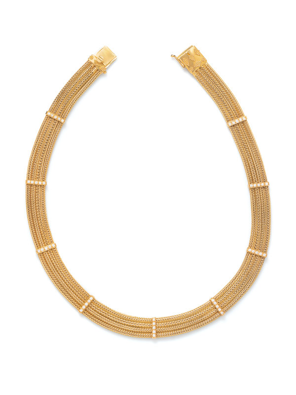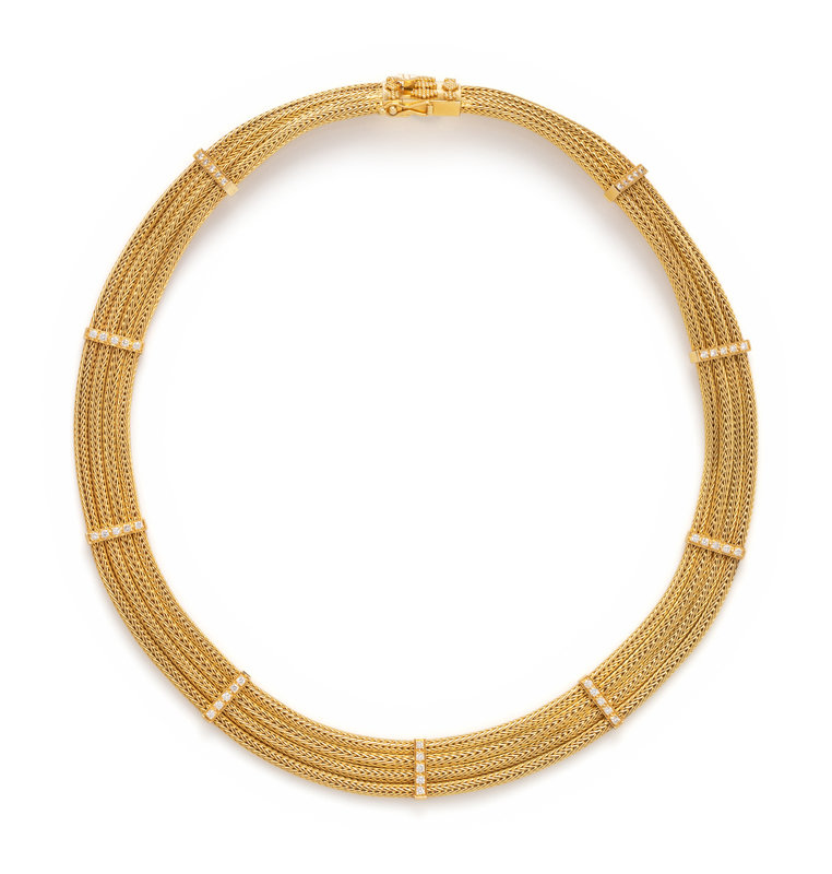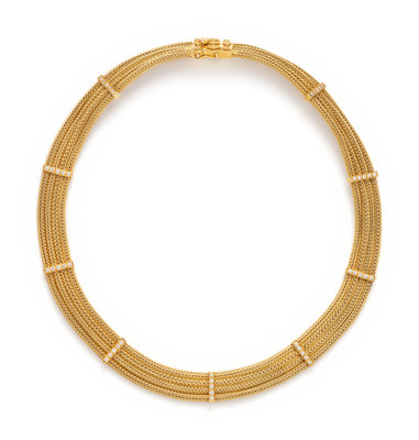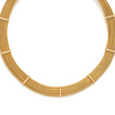 Consisting of four wheat link chains held together by nine stations containing 45 round brilliant cut diamonds weighing approximately 0.90 carat total. 17 1/2 inches long.