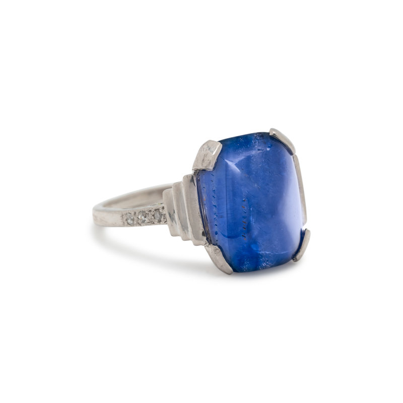 Containing one sugarloaf cabochon sapphire measuring approximately 13.15 x 10.30 x 7.80 mm and six old European cut diamonds. Mounted in platinum. Ring size 7.