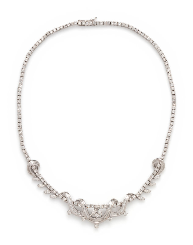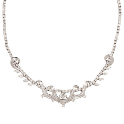 Containing numerous round brilliant, marquise and tapered baguette cut diamonds weighing approximately 15.00 carats total. Mounted in white gold. 17 inches long.