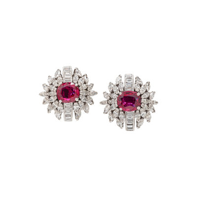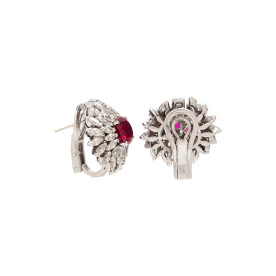 Containing two oval mixed cut rubies measuring approximately 8.47 x 7.37 x 3.00 mm and 8.08 x 7.38 x 3.00 mm, 56 marquise and 20 baguette cut diamonds weighing approximately 4.35 carats total, posts with clip backs. Mounted in white gold. 3/4 inch long.
