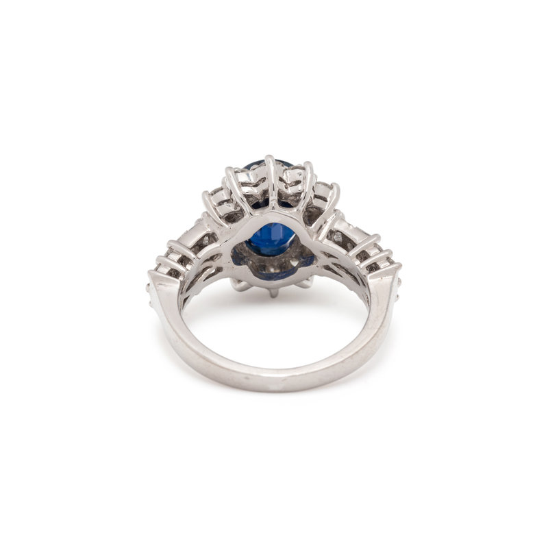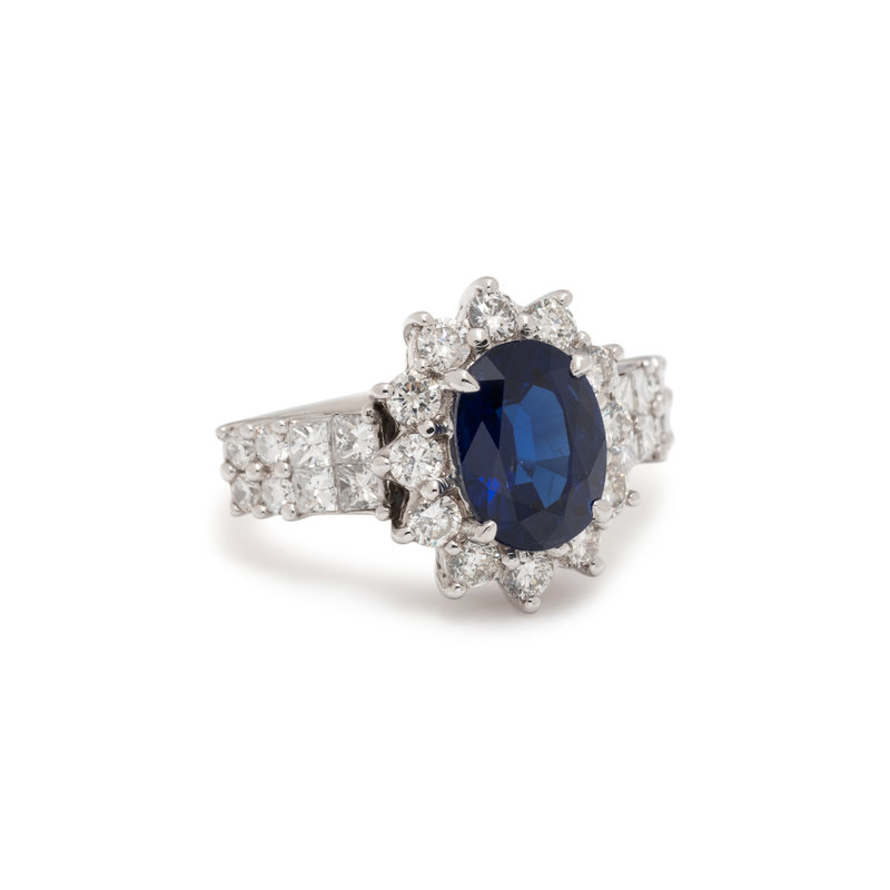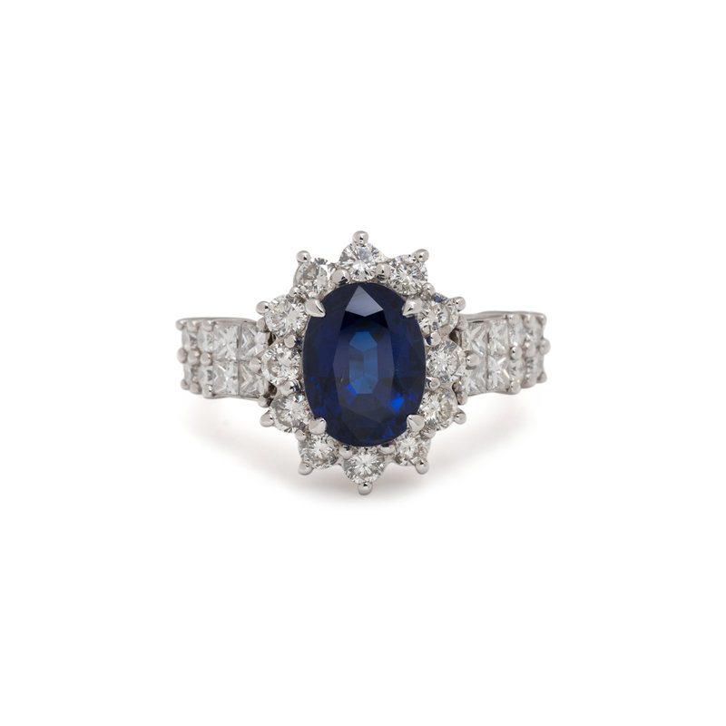 Containing one oval mixed cut sapphire measuring approximately 9.80 x 7.40 x 5.50 mm, 20 round brilliant and eight princess cut diamonds weighing approximately 1.50 carats total. Mounted in white gold. Ring size 5 3/4.