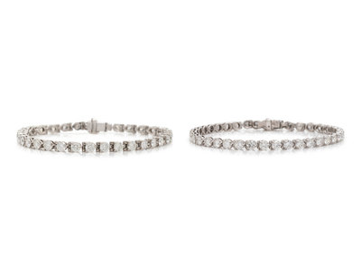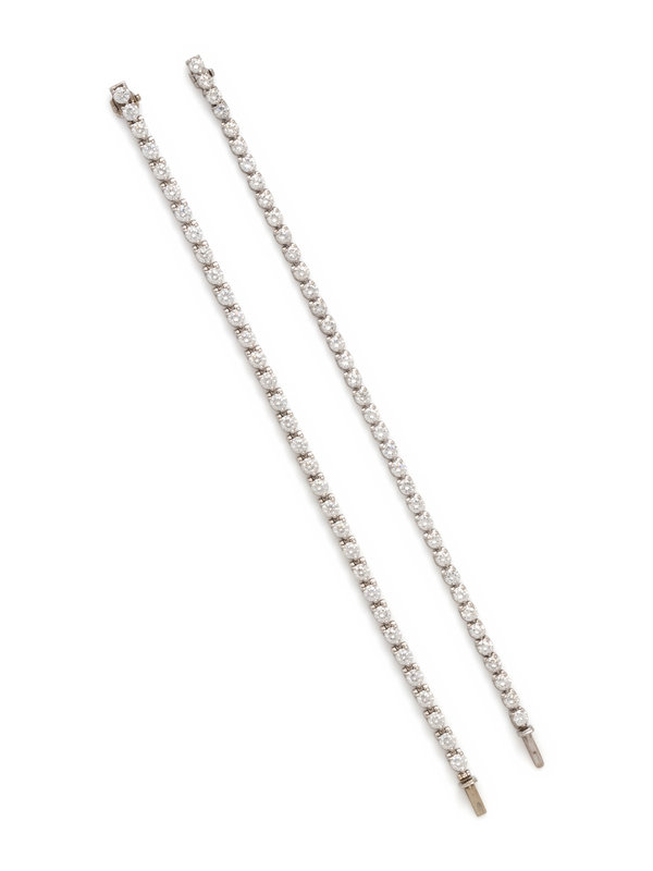 Containing 66 round brilliant cut diamonds weighing approximately 14.80 carats total. Mounted in platinum. 7 and 7 1/4 inches long.