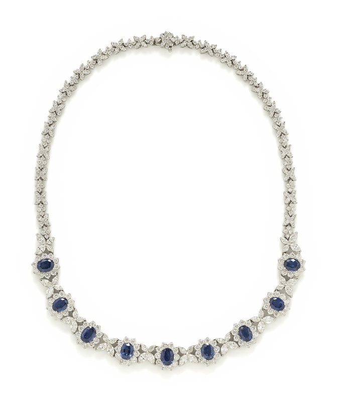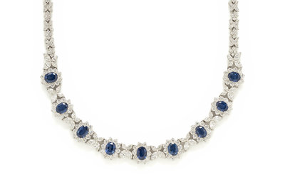 Containing nine cushion cut sapphires measuring approximately 8.00 x 6.00 mm and numerous round brilliant and marquise brilliant cut diamonds weighing approximately 14.00-17.00 carats total. Mounted in platinum. 17 1/2 inches long.