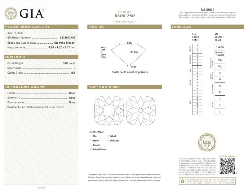 GIA, 2023, Report No. 5232012702, 3.08 carats, L color, VS1 clarity, No fluorescence