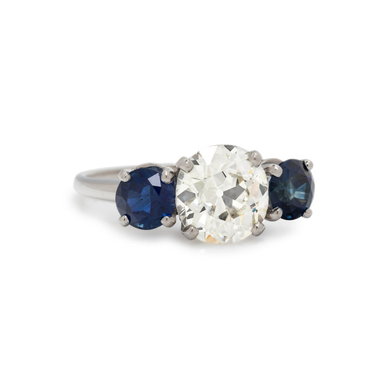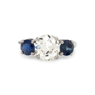 Containing one old mine brilliant cut diamond weighing 3.08 carats and two round mixed cut sapphires measuring approximately 5.80 x 5.75 x 4.10 mm and 5.75 x 5.75 x 3.75 mm. Mounted in platinum. Ring size 9 1/2.