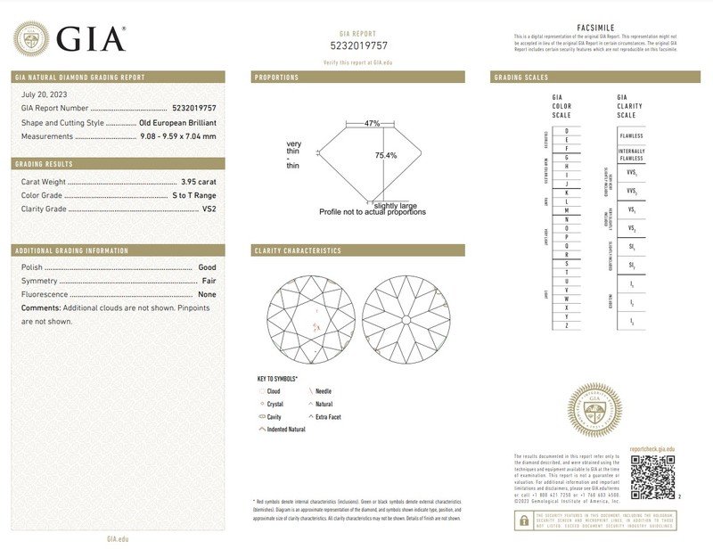 GIA, 2023, Report No. 5232019757, 3.95 carats, S-T color, VS2 clarity, No fluorescence