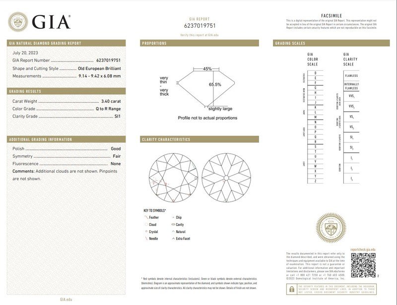 GIA, 2023, Report No. 6237019751, 3.40 carats, Q-R color, SI1 clarity, No fluorescence