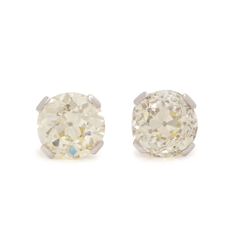 Containing two old European cut diamonds weighing 7.35 carats total. Mounted in platinum.