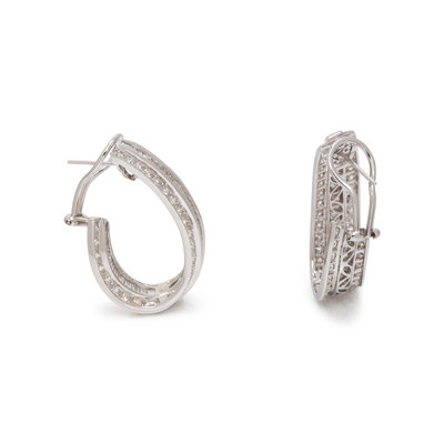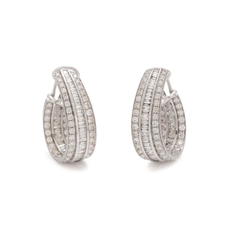 In an inside out style, containing numerous round brilliant cut and baguette cut diamonds weighing approximately 7.80 carats total, posts with clip backs. 1 1/4 inches long.