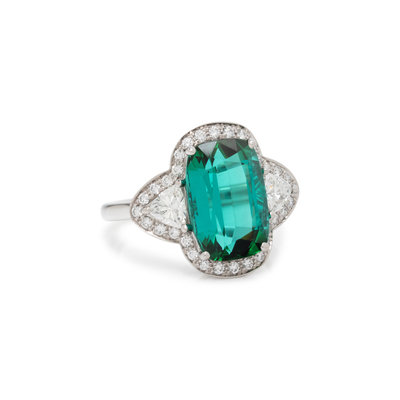 Containing one rectangular cushion cut tourmaline measuring approximately 12.85 x 8.80 x 6.15 mm, two trillion and 32 round brilliant cut diamonds weighing approximately 0.85 carat total. Mounted in platinum. Ring size 6 1/4.