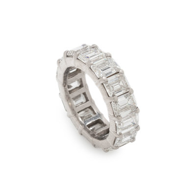 Containing 15 emerald cut diamonds weighing approximately 6.60 carats total. Mounted in platinum. Ring size 3 1/2.