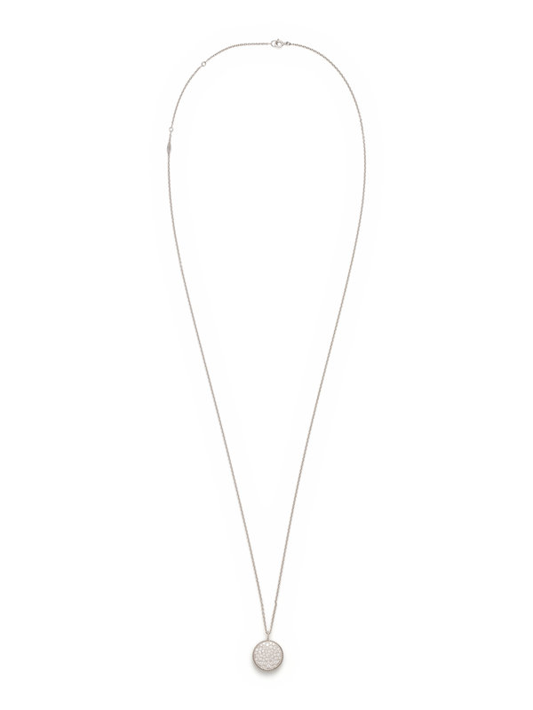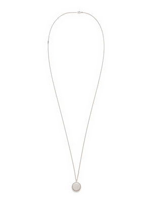 Consisting of a pendant containing 57 round brilliant cut diamonds weighing approximately 1.70 carats total suspended from a cable link longchain. 32 inches long.