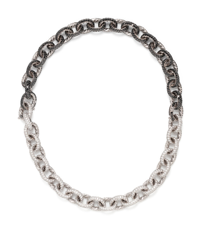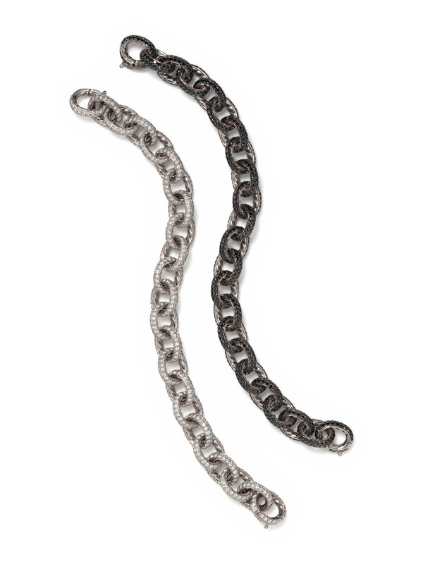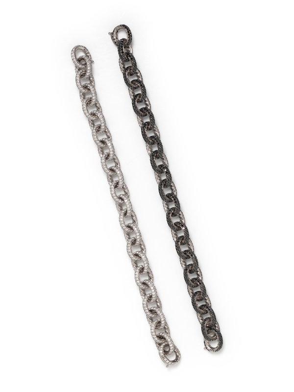 Consisting of two cable link bracelets pave set with numerous round brilliant cut white and black diamonds weighing approximately 15.00 carats per bracelet, connecting to form a necklace. Mounted in white gold. 7 1/2 and 8 inches long.