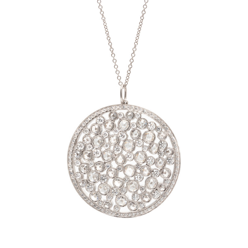 Consisting of a cable link chain suspending a pendant containing numerous rose and round brilliant cut diamonds weighing approximately 2.30 carats total. Chain: 18 inches long. Pendant: 1 1/4 inches wide.