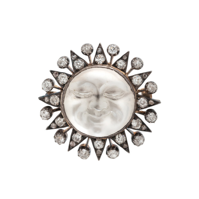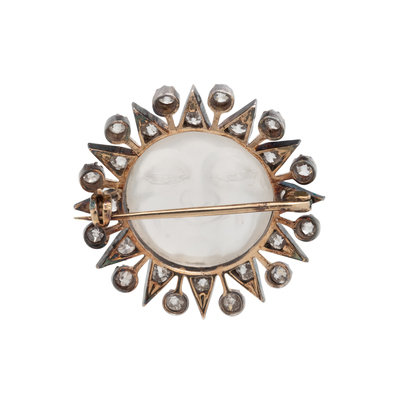 Containing one round carved cabochon moonstone in a moon motif and 36 old European and rose cut diamonds weighing approximately 1.00 carat total. Mounted in silver-topped gold. 1 inch wide.