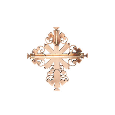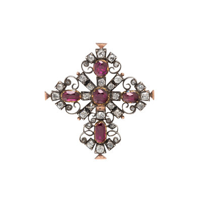 Containing five cushion shaped foil-backed rubies and 36 old mine cut diamonds weighing approximately 2.50 carats total. 1 7/8 x 1 3/4 inches.