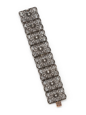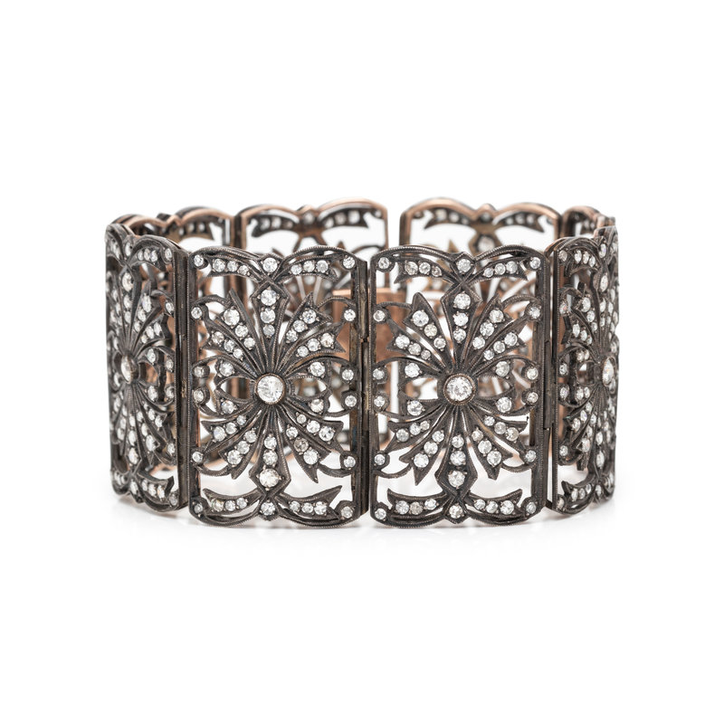 Consisting of eight panels in openwork design, containing eight old mine cut diamonds weighing approximately 0.80 carat total and numerous old mine and single cut diamonds weighing approximately 7.50 carats total. 7 1/4 inches long.